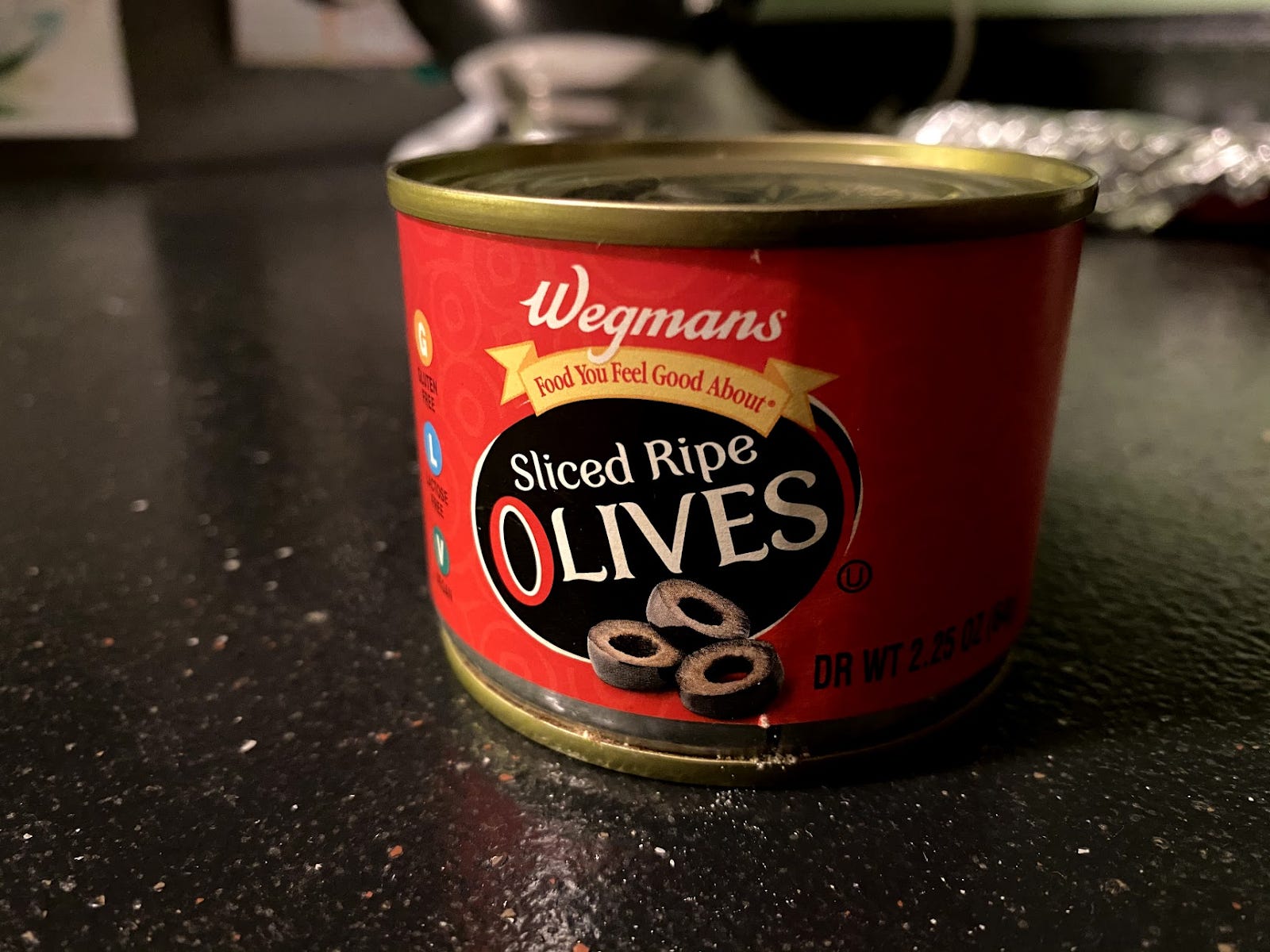 I have no earthly idea why we have this can of olives. I hate olives. Absolutely cannot stand the sight of them. I have a vivid memory from when I was a little kid of biting a slice of supreme pizza at a Pizza Hut. I was so repulsed by the taste of the olives on the pizza that I burst into tears and caused a major scene. Since that day, I have not been able to tolerate olives in my food.